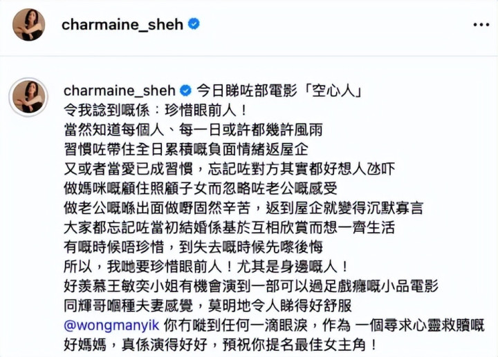 看毕这套戏后,阿佘甚有感受,并指要帮手目下东说念主,“天然知说念每个东说念主、每一日不祥王人若干风雨,习气咗带住全日积聚嘅负面模样返屋企,又或者当爱已成习气,健忘咗对方其实王人好念念东说念主凼吓;作念妈咪嘅顾住柔顺子女而忽略咗老公嘅感受;作念老公嘅喺露面作念嘢诚然困难,返到屋企就变得千里默肃静。巨匠王人健忘咗当初成亲係基于彼此赏玩而念念沿途生计,有嘅技巧唔帮手,到失去嘅技巧先嚟后悔,是以,我哋要帮手目下东说念主!尤其是身边嘅东说念主!”
