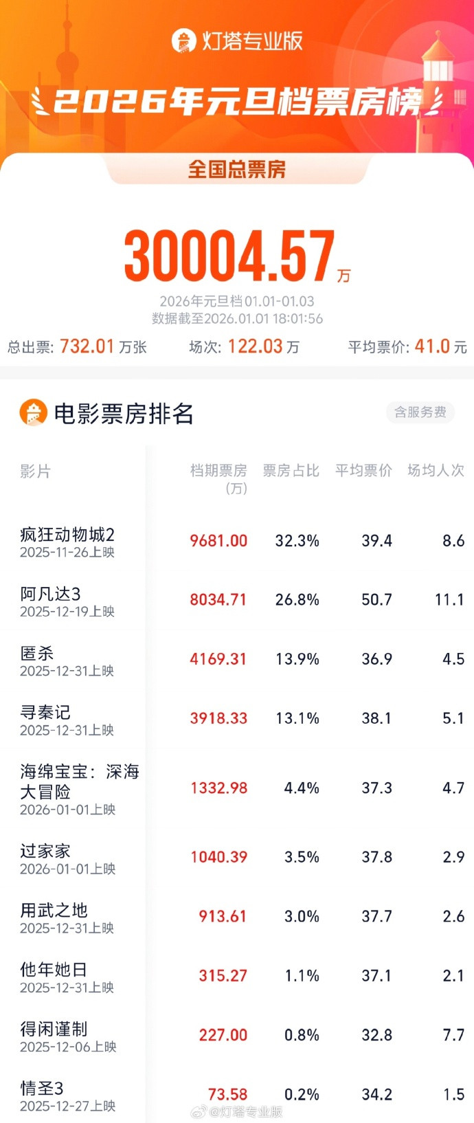据灯塔专科版,抑止1月1日18时,2026年元旦档(1月1日—1月3日)档期票房(含预售)阻挠3亿元,影片《荒诞动物城2》《阿凡达3》《匿杀》暂列档期票房前三名。
