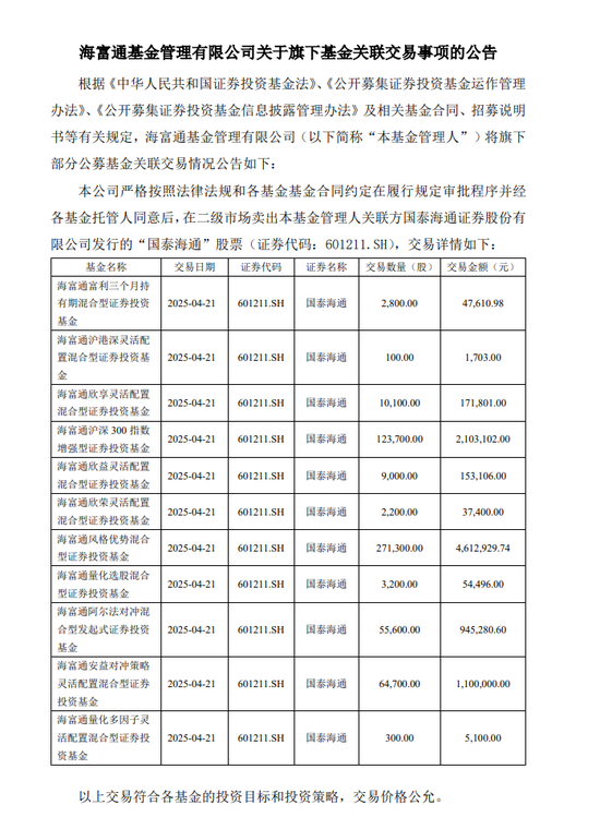最新公告裸露,海富通基金在二级市集卖出了关系方国泰海通证券刊行的“国泰海通”股票。