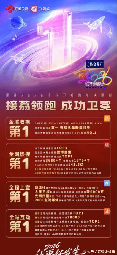 江苏卫视与特仑苏聚拢呈现的《特仑苏更好2026江苏卫视跨年演唱会》于2025年12月31日晚圆满结果。晚会于19:30在江苏卫视、ai荔枝双平台同步直播,第九次选址中国澳门星河综艺馆。据最新数据,晚会CSM35城收视率达2.753%,CSM71城收视2.480%,在当晚各网别收视名次中均位列第一,得胜赓续了其跨年品牌的当先地位。全网热搜累计超3680次,主话题阅读量达143.6亿,直播不雅看东说念主次超850万,阛阓影响力与不雅众口碑再次赢得考据。