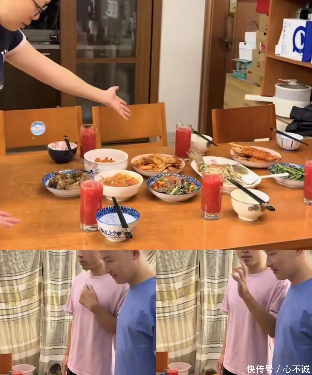 很快一桌子菜王人了,浩男一到就被拉着猜菜是谁作念得,猜错就得把菜吃光。