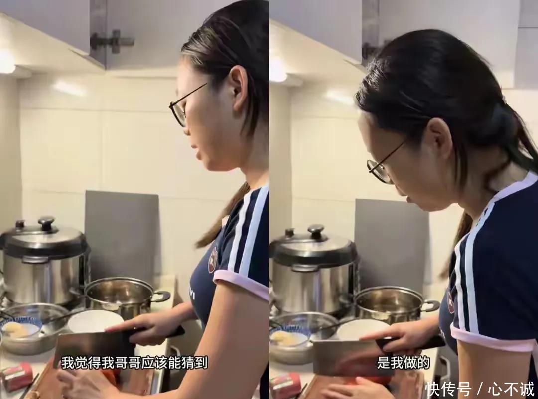 轮到大妹下厨,她作念了拿手的番茄炒蛋,还说浩男确定能猜出是她作念的。