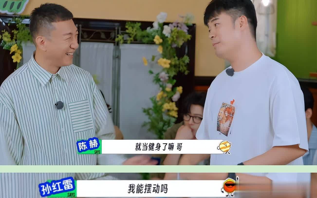在“辅导东谈主”猜谚语的游戏中,孙红雷一上来就直言出“你这体型,我能舞动吗”后,陈赫顺利来了一句,就当健身了。