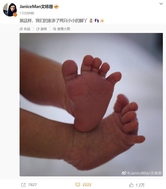 9月30日,女星文咏珊发博:“就这么,咱们的家多了两只小小的脚丫。”并晒出小宝宝的脚丫照,官宣当妈。