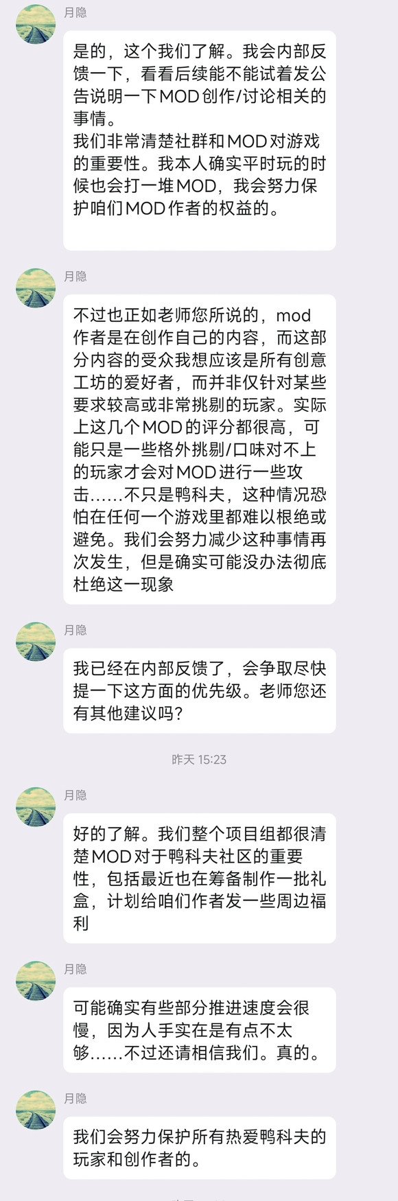 疑似官方运营与 MOD 作家的聊天记载流出——气魄不是强硬劝诫,而是:卑微交流、主动安抚、以致奉上摆布礼物,而对举报问题的玩家,却被定性为——“某些坏心群体”。