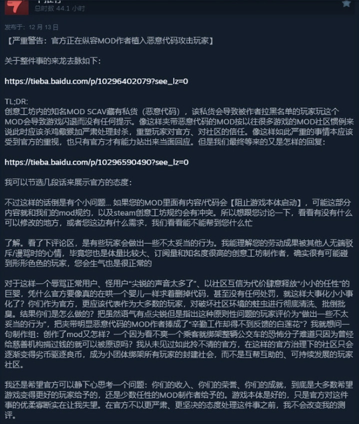 第一阶段:玩家在贴吧揭露 MOD 内含坏心代码,吧务删帖,试图定性为“两边皆有职守”。
