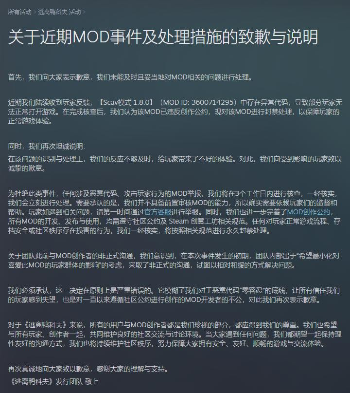 在 Steam 发布的公告中,《逃离鸭科夫》刊行团队承认了两点豪恣